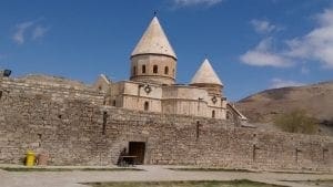Our last hotel in Tabriz, like the one in Tehran, overlooked the city, but that was good for communications. My lasting memories of this city of a mosque, shattered in an earthquake, being meticulously pieced together, of some shrines of holy men in the past, and the only time where the sad photographs of the martyrs of the Iran-Iraq war that are attached to lamp-posts in the city centres included Christians on a large board by a monastery. We travelled to the north near Samarkand, almost to the Russian border, to a remote Armenian monastery at the foot of Mount Ararat where the ark is said to have touched land after the Flood. The church is dedicated to Saint Gregory and is the focal point of an immense pilgrimage in the summer. Huge courtyards welcome the pilgrims though the church itself is small. Under sharp blue skies a wind howled. We were bitterly cold, the only visitors, watched by a few shepherds and their small flocks scattered among the rocks in the vast, mountainous landscape which had witnessed invading hordes for centuries. To the north, Russia, and Turkey to the west.